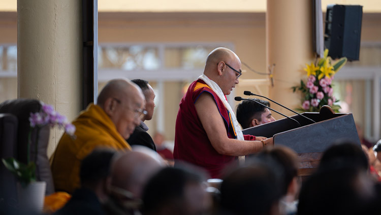 Le Sikyong Penpa Tséring lut la déclaration du Kashag marquant l'événement d'aujourd'hui, d'abord en tibétain, puis en anglais. Il évoqua pour commencer que ce jour propice, marquant le 75ème anniversaire de l'accession de Sa Sainteté le Dalaï-Lama à la direction spirituelle et temporelle du Tibet était également célébré dans le cadre de l'Année de la compassion, célèbrant le 90ème anniversaire de Sa Sainteté.